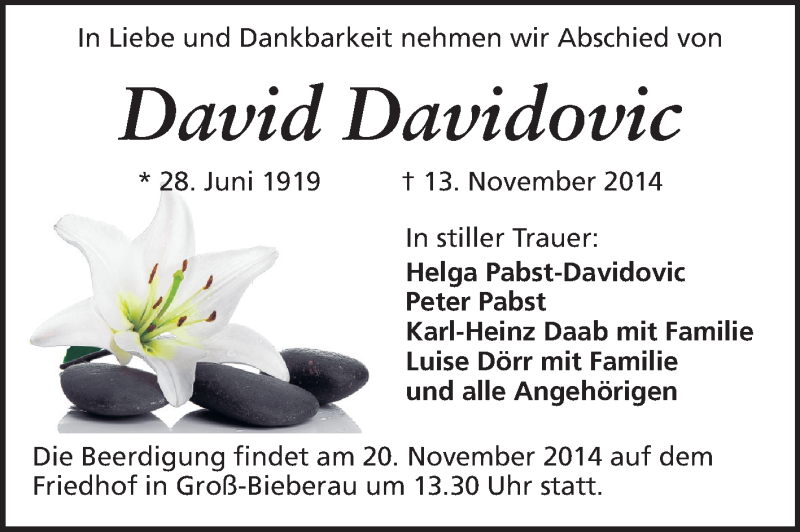 Hier finden Sie alle Traueranzeigen aus der Zeitung, die bisher für David Davidovic erschienen sind. Weitere Traueranzeigen, die in der Zeitung erscheinen, werden hier ebenfalls aufgelistet