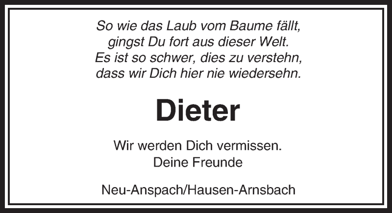 Hier finden Sie alle Traueranzeigen aus der Zeitung, die bisher für Dieter erschienen sind. Weitere Traueranzeigen, die in der Zeitung erscheinen, werden hier ebenfalls aufgelistet