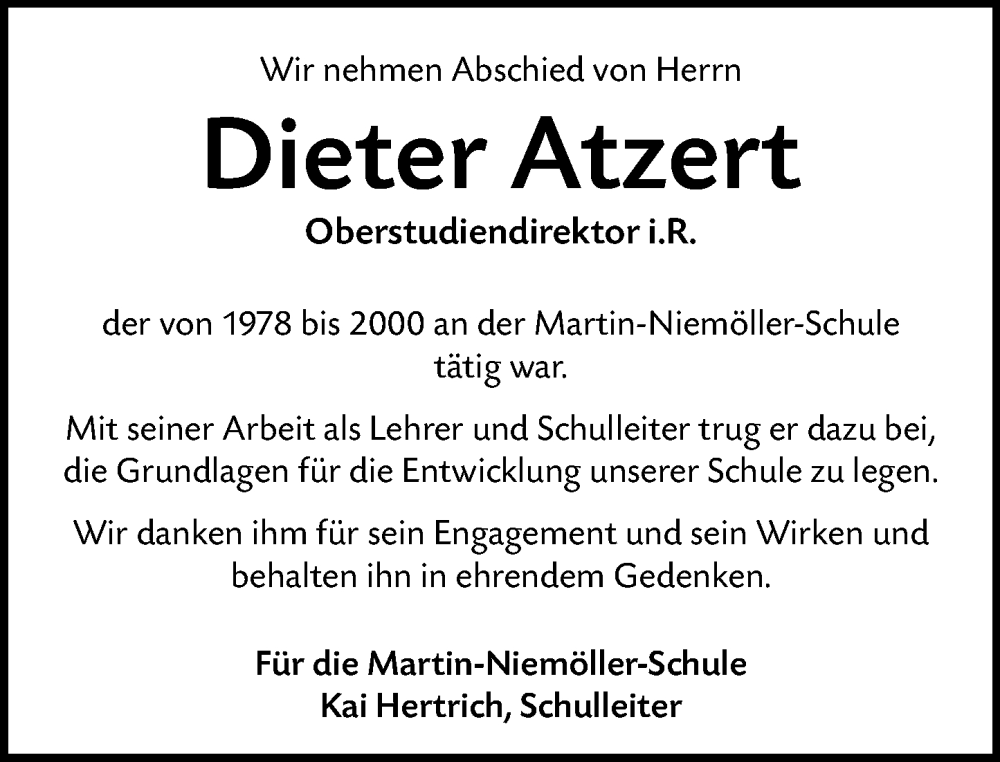 Hier finden Sie alle Traueranzeigen aus der Zeitung, die bisher für Dieter Atzert erschienen sind. Weitere Traueranzeigen, die in der Zeitung erscheinen, werden hier ebenfalls aufgelistet