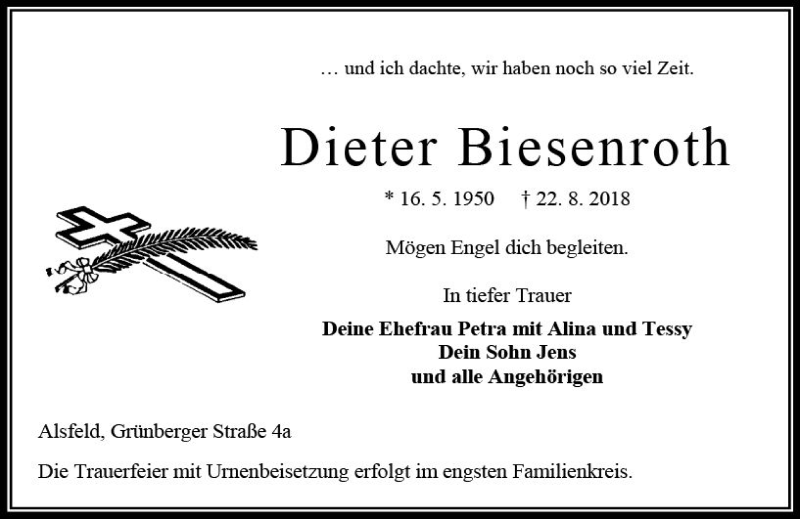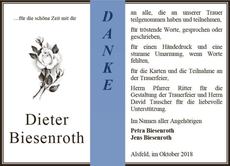 Hier finden Sie alle Traueranzeigen aus der Zeitung, die bisher für Dieter Biesenroth erschienen sind. Weitere Traueranzeigen, die in der Zeitung erscheinen, werden hier ebenfalls aufgelistet