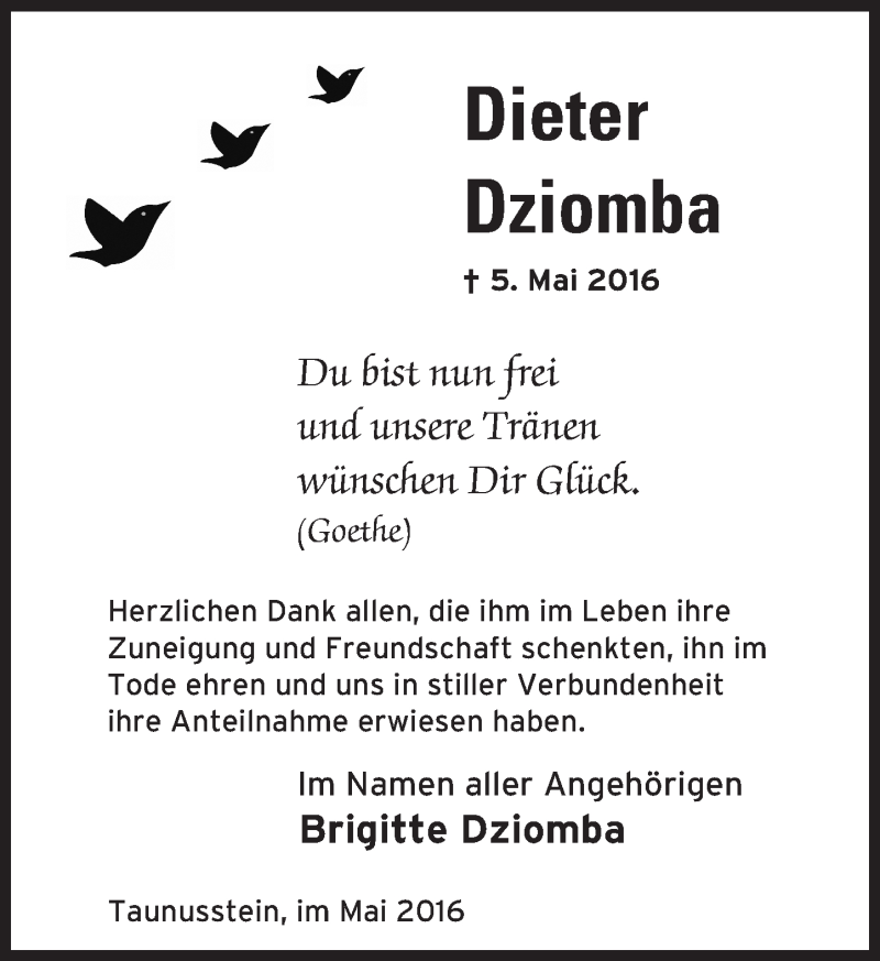 Hier finden Sie alle Traueranzeigen aus der Zeitung, die bisher für Dieter Dziomba erschienen sind. Weitere Traueranzeigen, die in der Zeitung erscheinen, werden hier ebenfalls aufgelistet