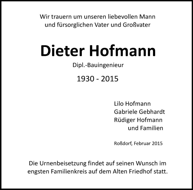 Hier finden Sie alle Traueranzeigen aus der Zeitung, die bisher für Dieter Hofmann erschienen sind. Weitere Traueranzeigen, die in der Zeitung erscheinen, werden hier ebenfalls aufgelistet