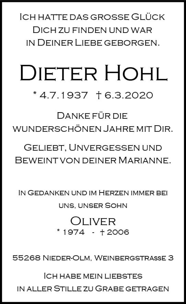 Hier finden Sie alle Traueranzeigen aus der Zeitung, die bisher für Dieter Hohl erschienen sind. Weitere Traueranzeigen, die in der Zeitung erscheinen, werden hier ebenfalls aufgelistet