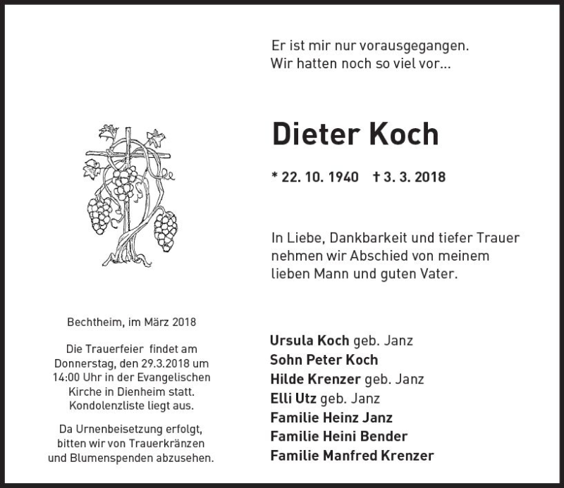 Hier finden Sie alle Traueranzeigen aus der Zeitung, die bisher für Dieter Koch erschienen sind. Weitere Traueranzeigen, die in der Zeitung erscheinen, werden hier ebenfalls aufgelistet