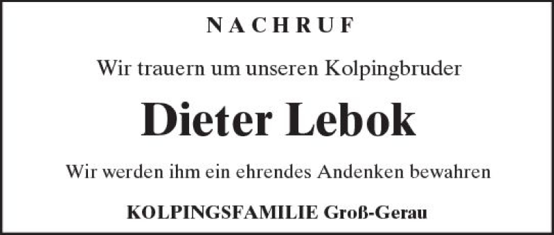 Hier finden Sie alle Traueranzeigen aus der Zeitung, die bisher für Dieter Lebok erschienen sind. Weitere Traueranzeigen, die in der Zeitung erscheinen, werden hier ebenfalls aufgelistet
