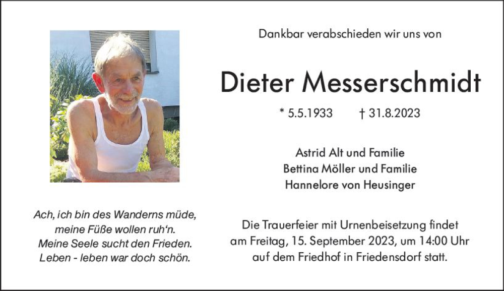 Hier finden Sie alle Traueranzeigen aus der Zeitung, die bisher für Dieter Messerschmidt erschienen sind. Weitere Traueranzeigen, die in der Zeitung erscheinen, werden hier ebenfalls aufgelistet