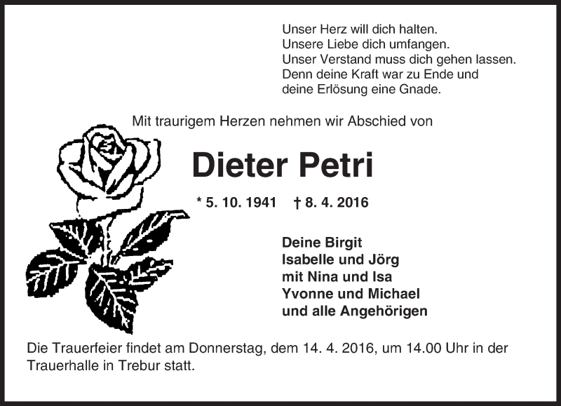 Hier finden Sie alle Traueranzeigen aus der Zeitung, die bisher für Dieter Petri erschienen sind. Weitere Traueranzeigen, die in der Zeitung erscheinen, werden hier ebenfalls aufgelistet