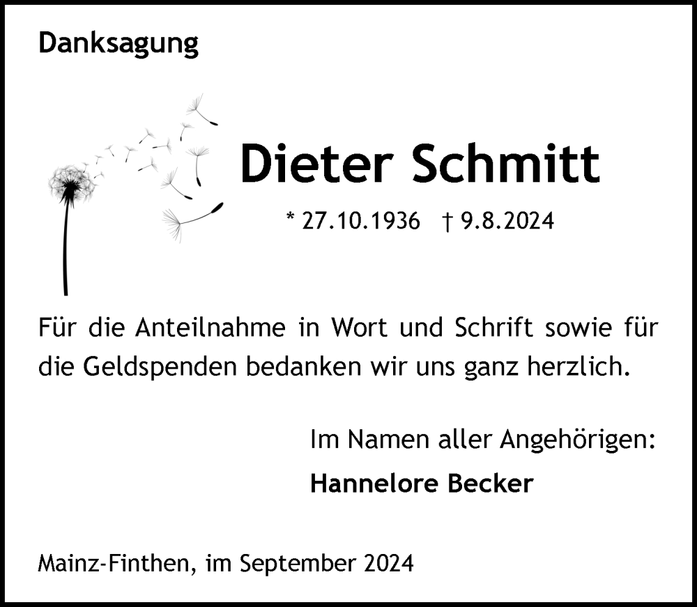 Hier finden Sie alle Traueranzeigen aus der Zeitung, die bisher für Dieter Schmitt erschienen sind. Weitere Traueranzeigen, die in der Zeitung erscheinen, werden hier ebenfalls aufgelistet
