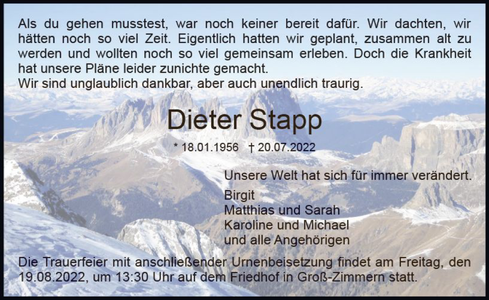 Hier finden Sie alle Traueranzeigen aus der Zeitung, die bisher für Dieter Stapp erschienen sind. Weitere Traueranzeigen, die in der Zeitung erscheinen, werden hier ebenfalls aufgelistet