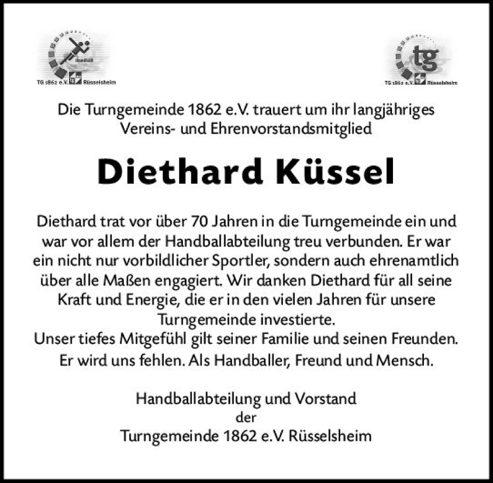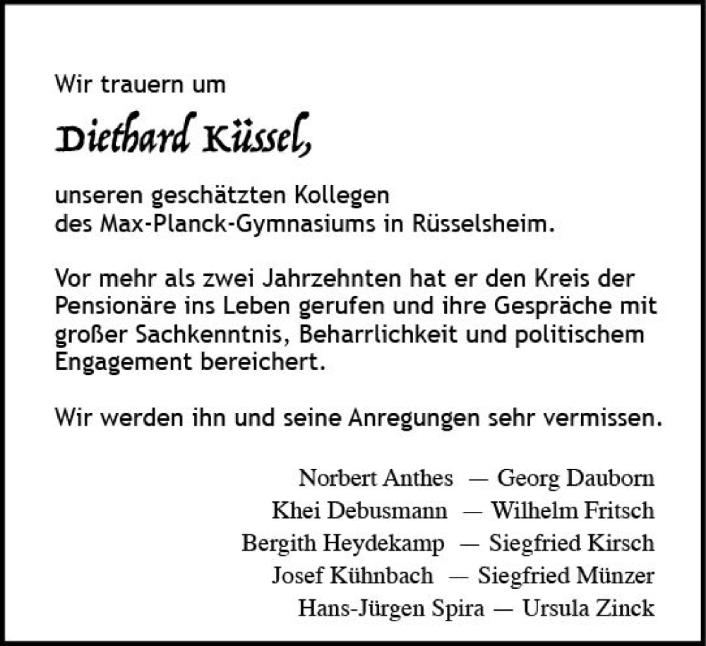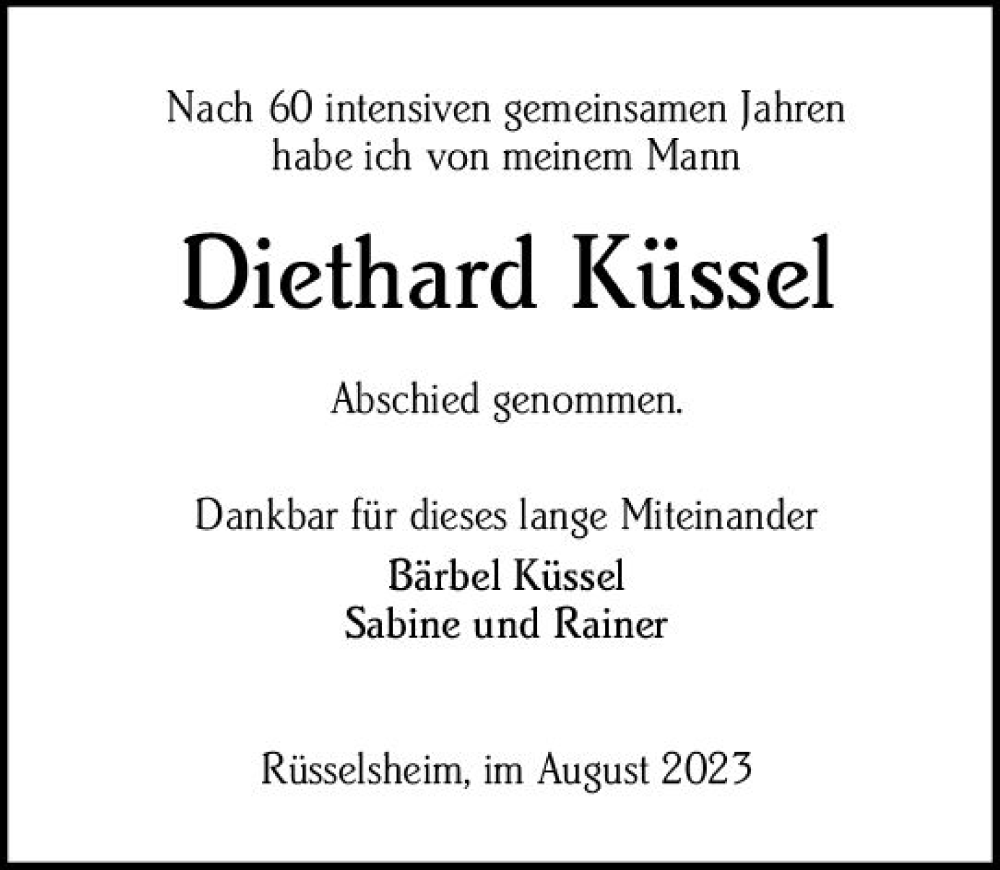 Hier finden Sie alle Traueranzeigen aus der Zeitung, die bisher für Diethard Küssel erschienen sind. Weitere Traueranzeigen, die in der Zeitung erscheinen, werden hier ebenfalls aufgelistet