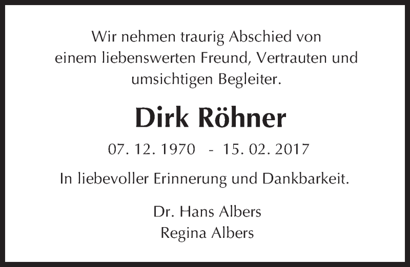 Hier finden Sie alle Traueranzeigen aus der Zeitung, die bisher für Dirk Röhner erschienen sind. Weitere Traueranzeigen, die in der Zeitung erscheinen, werden hier ebenfalls aufgelistet