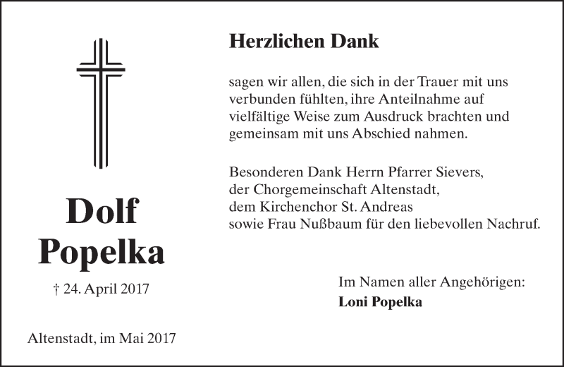 Hier finden Sie alle Traueranzeigen aus der Zeitung, die bisher für Dolf Popelka erschienen sind. Weitere Traueranzeigen, die in der Zeitung erscheinen, werden hier ebenfalls aufgelistet