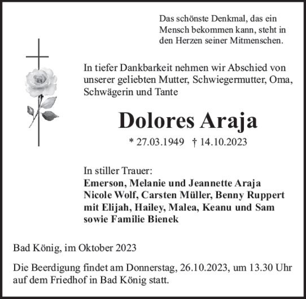 Hier finden Sie alle Traueranzeigen aus der Zeitung, die bisher für Dolores Araja erschienen sind. Weitere Traueranzeigen, die in der Zeitung erscheinen, werden hier ebenfalls aufgelistet