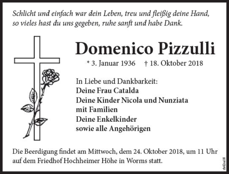 Hier finden Sie alle Traueranzeigen aus der Zeitung, die bisher für Domenico Pizzulli erschienen sind. Weitere Traueranzeigen, die in der Zeitung erscheinen, werden hier ebenfalls aufgelistet