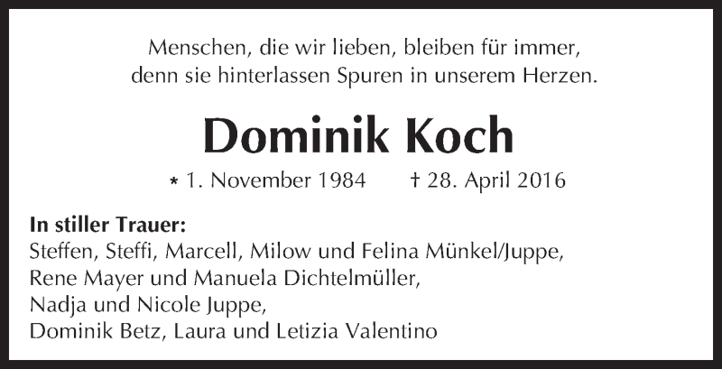 Hier finden Sie alle Traueranzeigen aus der Zeitung, die bisher für Dominik Koch erschienen sind. Weitere Traueranzeigen, die in der Zeitung erscheinen, werden hier ebenfalls aufgelistet