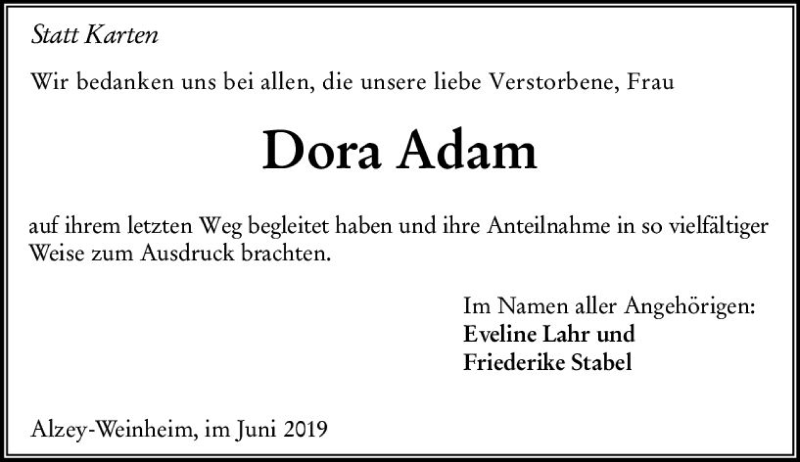 Hier finden Sie alle Traueranzeigen aus der Zeitung, die bisher für Dora Adam erschienen sind. Weitere Traueranzeigen, die in der Zeitung erscheinen, werden hier ebenfalls aufgelistet