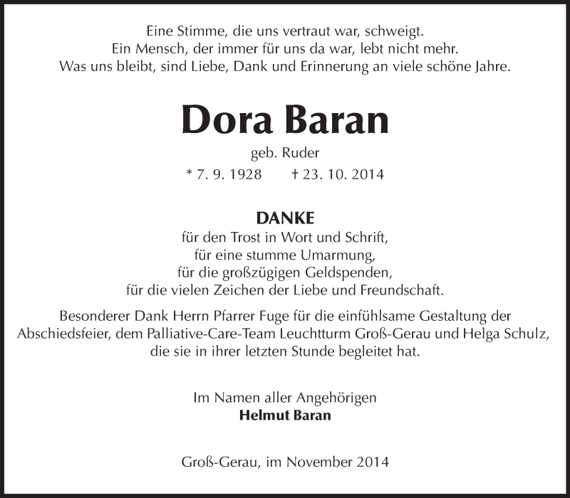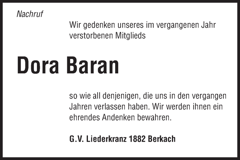 Hier finden Sie alle Traueranzeigen aus der Zeitung, die bisher für Dora Baran erschienen sind. Weitere Traueranzeigen, die in der Zeitung erscheinen, werden hier ebenfalls aufgelistet