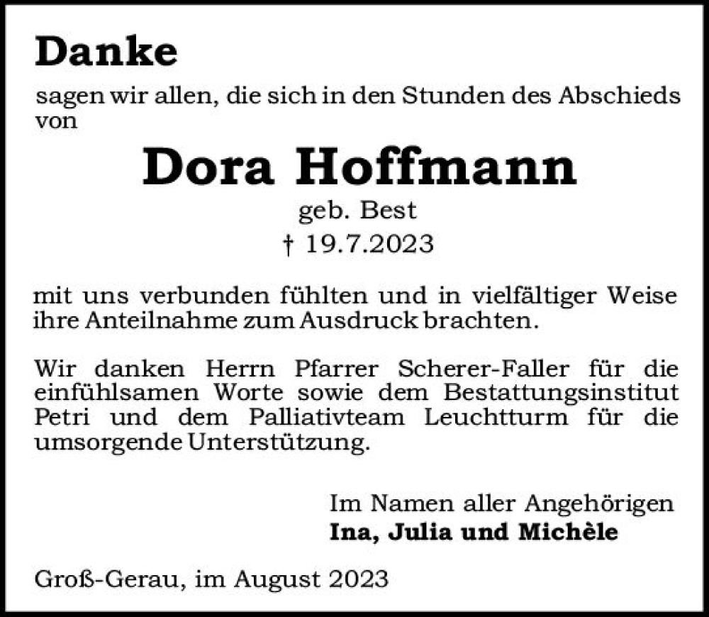 Hier finden Sie alle Traueranzeigen aus der Zeitung, die bisher für Dora Hoffmann erschienen sind. Weitere Traueranzeigen, die in der Zeitung erscheinen, werden hier ebenfalls aufgelistet