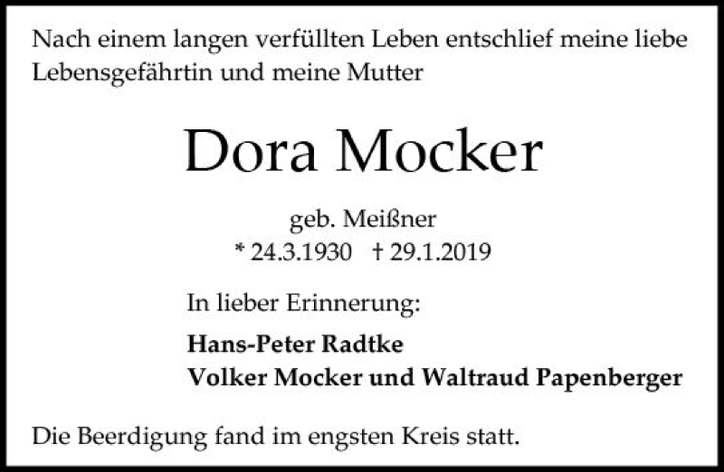 Hier finden Sie alle Traueranzeigen aus der Zeitung, die bisher für Dora Mocker erschienen sind. Weitere Traueranzeigen, die in der Zeitung erscheinen, werden hier ebenfalls aufgelistet