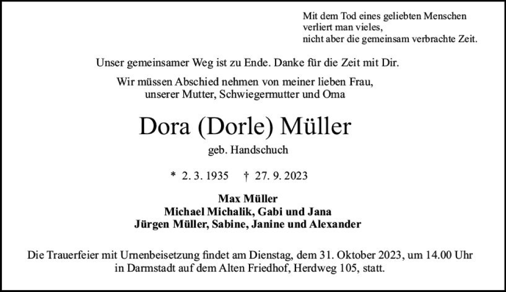 Hier finden Sie alle Traueranzeigen aus der Zeitung, die bisher für Dora Müller erschienen sind. Weitere Traueranzeigen, die in der Zeitung erscheinen, werden hier ebenfalls aufgelistet