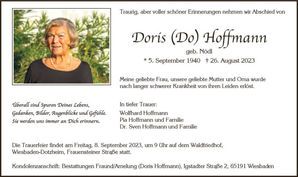 Hier finden Sie alle Traueranzeigen aus der Zeitung, die bisher für Doris Hoffmann erschienen sind. Weitere Traueranzeigen, die in der Zeitung erscheinen, werden hier ebenfalls aufgelistet