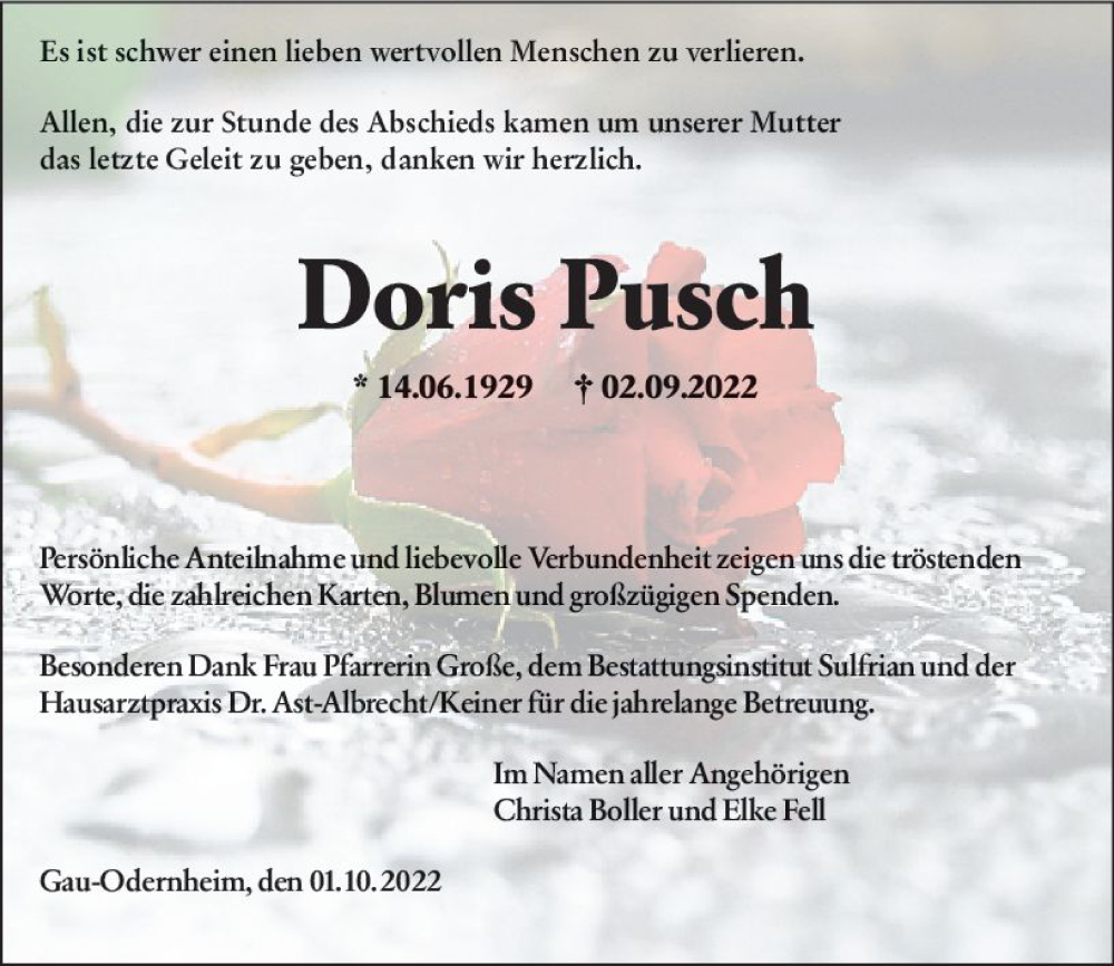 Hier finden Sie alle Traueranzeigen aus der Zeitung, die bisher für Doris Pusch erschienen sind. Weitere Traueranzeigen, die in der Zeitung erscheinen, werden hier ebenfalls aufgelistet