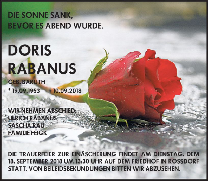 Hier finden Sie alle Traueranzeigen aus der Zeitung, die bisher für Doris Rabanus erschienen sind. Weitere Traueranzeigen, die in der Zeitung erscheinen, werden hier ebenfalls aufgelistet