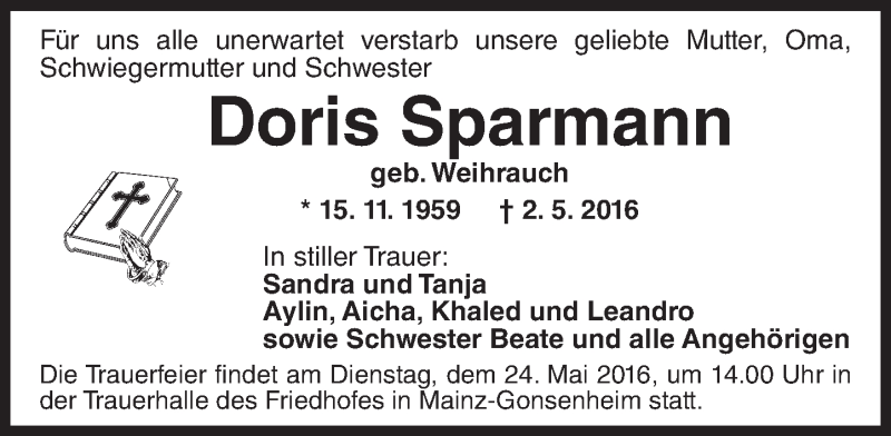 Hier finden Sie alle Traueranzeigen aus der Zeitung, die bisher für Doris Sparmann erschienen sind. Weitere Traueranzeigen, die in der Zeitung erscheinen, werden hier ebenfalls aufgelistet