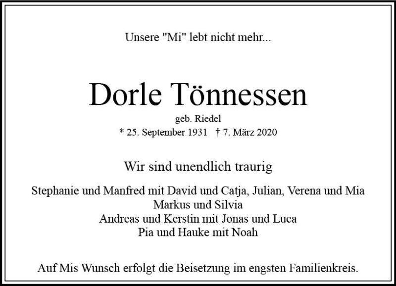 Hier finden Sie alle Traueranzeigen aus der Zeitung, die bisher für Dorle Tönnessen erschienen sind. Weitere Traueranzeigen, die in der Zeitung erscheinen, werden hier ebenfalls aufgelistet