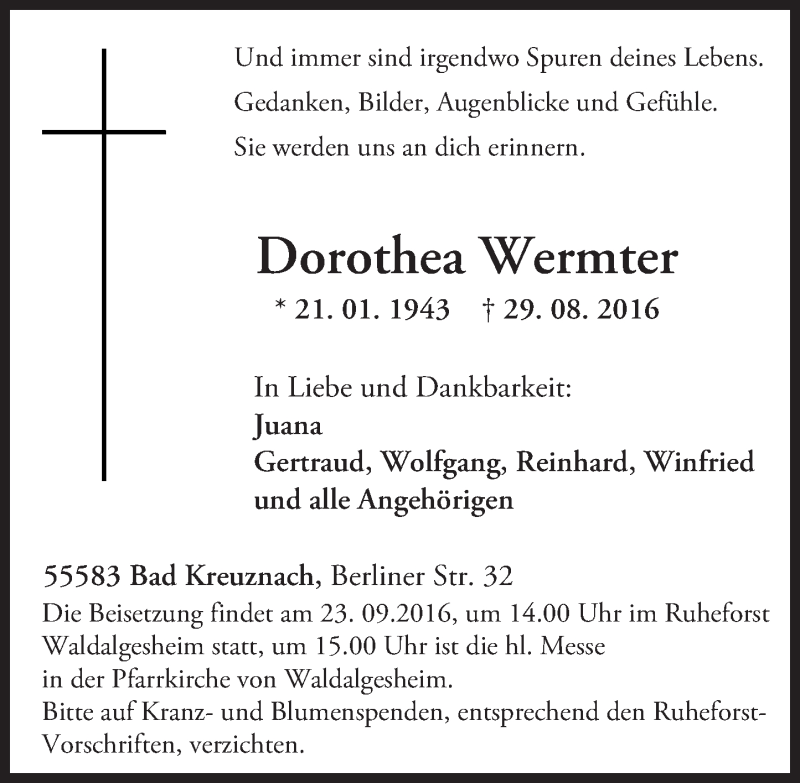 Hier finden Sie alle Traueranzeigen aus der Zeitung, die bisher für Dorothea Wermter erschienen sind. Weitere Traueranzeigen, die in der Zeitung erscheinen, werden hier ebenfalls aufgelistet