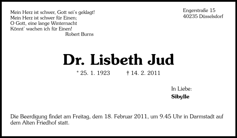 Hier finden Sie alle Traueranzeigen aus der Zeitung, die bisher für Dr.Lisbeth Jud erschienen sind. Weitere Traueranzeigen, die in der Zeitung erscheinen, werden hier ebenfalls aufgelistet