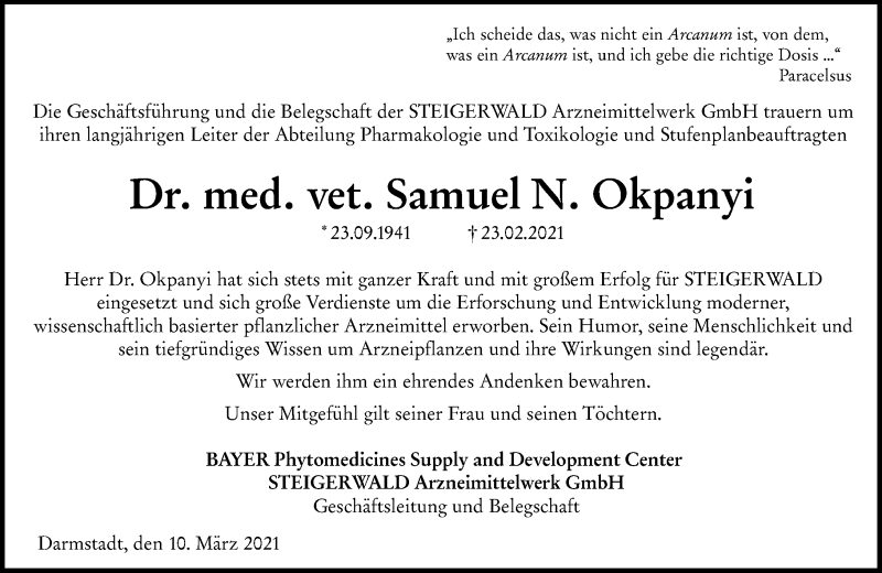 Hier finden Sie alle Traueranzeigen aus der Zeitung, die bisher für Dr. med. vet. Samuel N. Okpanyi erschienen sind. Weitere Traueranzeigen, die in der Zeitung erscheinen, werden hier ebenfalls aufgelistet