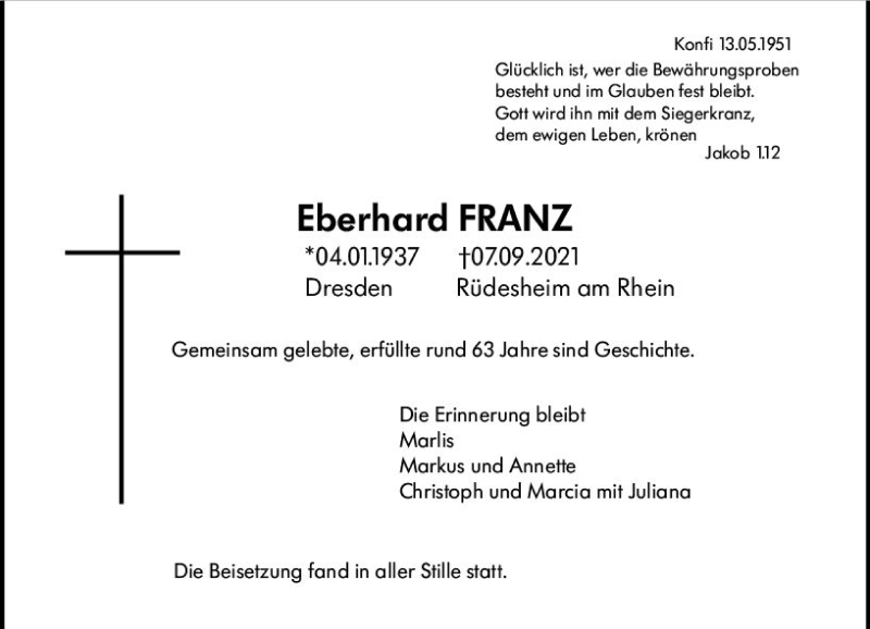 Hier finden Sie alle Traueranzeigen aus der Zeitung, die bisher für Eberhard Franz erschienen sind. Weitere Traueranzeigen, die in der Zeitung erscheinen, werden hier ebenfalls aufgelistet