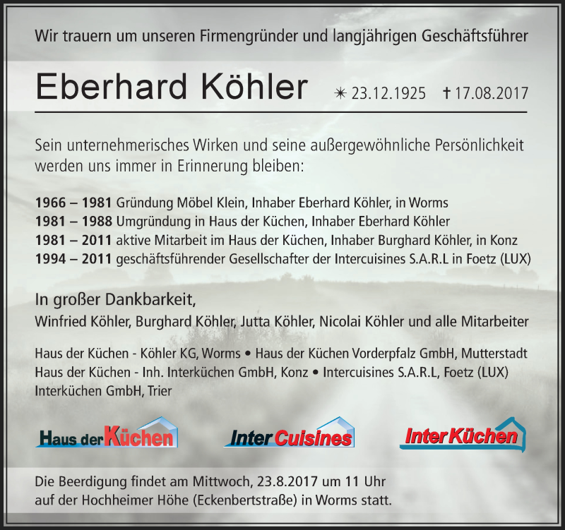 Hier finden Sie alle Traueranzeigen aus der Zeitung, die bisher für Eberhard Köhler erschienen sind. Weitere Traueranzeigen, die in der Zeitung erscheinen, werden hier ebenfalls aufgelistet