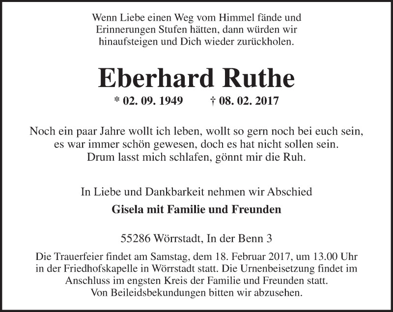 Hier finden Sie alle Traueranzeigen aus der Zeitung, die bisher für Eberhard Ruthe erschienen sind. Weitere Traueranzeigen, die in der Zeitung erscheinen, werden hier ebenfalls aufgelistet