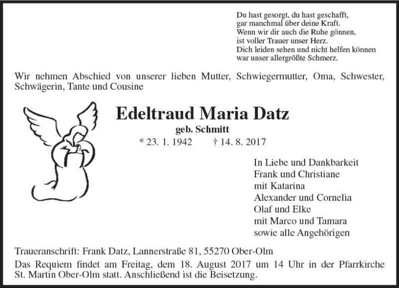 Hier finden Sie alle Traueranzeigen aus der Zeitung, die bisher für Edeltraucl Maria Datz erschienen sind. Weitere Traueranzeigen, die in der Zeitung erscheinen, werden hier ebenfalls aufgelistet