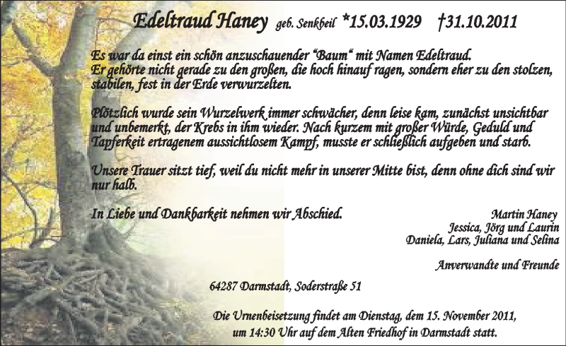 Hier finden Sie alle Traueranzeigen aus der Zeitung, die bisher für Edeltraud Haney erschienen sind. Weitere Traueranzeigen, die in der Zeitung erscheinen, werden hier ebenfalls aufgelistet