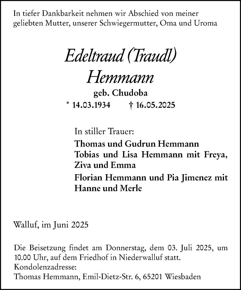 Hier finden Sie alle Traueranzeigen aus der Zeitung, die bisher für Edeltraud Hemmann erschienen sind. Weitere Traueranzeigen, die in der Zeitung erscheinen, werden hier ebenfalls aufgelistet