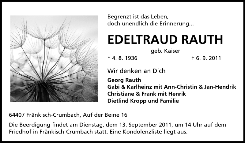 Hier finden Sie alle Traueranzeigen aus der Zeitung, die bisher für Edeltraud Rauth erschienen sind. Weitere Traueranzeigen, die in der Zeitung erscheinen, werden hier ebenfalls aufgelistet