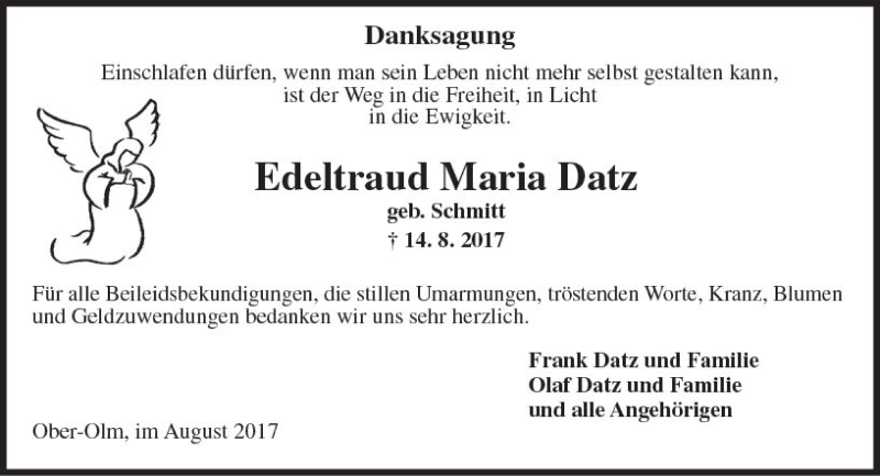 Hier finden Sie alle Traueranzeigen aus der Zeitung, die bisher für Edeltraud Maria Datz erschienen sind. Weitere Traueranzeigen, die in der Zeitung erscheinen, werden hier ebenfalls aufgelistet