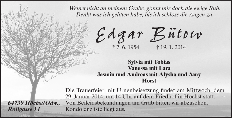 Hier finden Sie alle Traueranzeigen aus der Zeitung, die bisher für Edgar Bütow erschienen sind. Weitere Traueranzeigen, die in der Zeitung erscheinen, werden hier ebenfalls aufgelistet