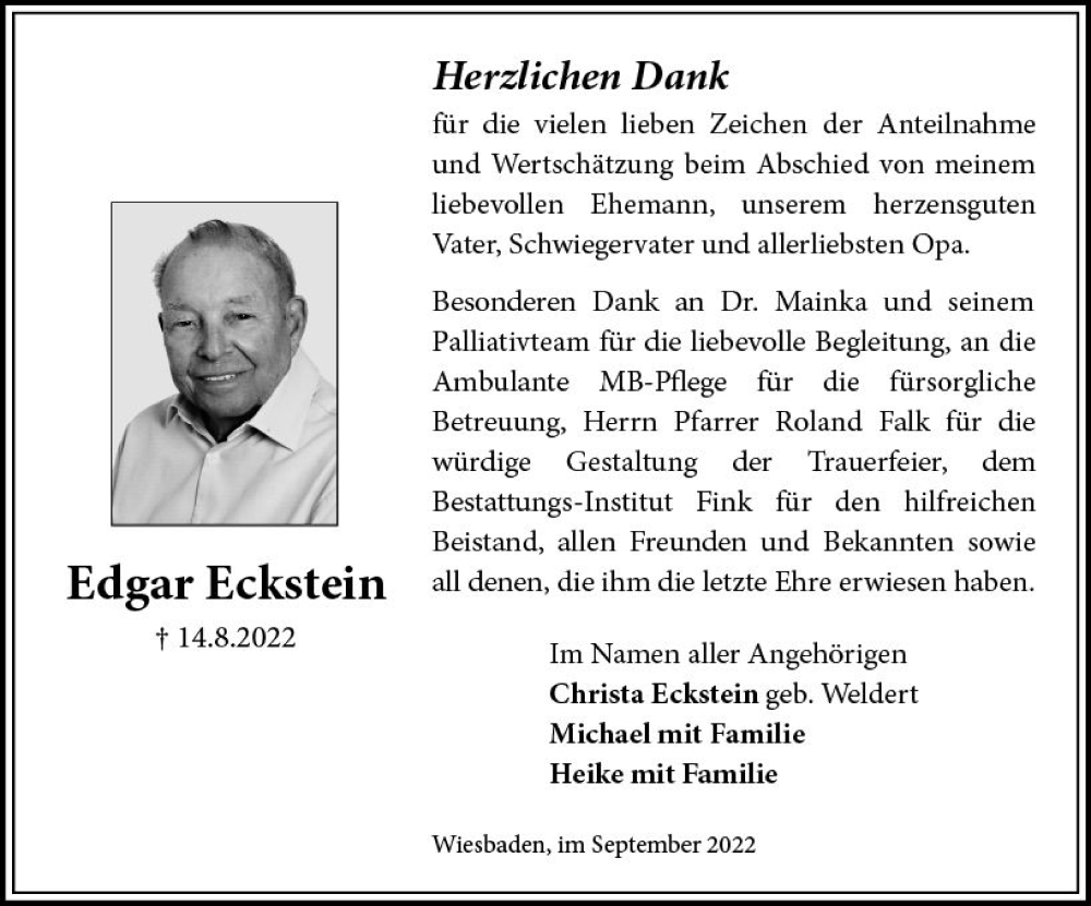 Hier finden Sie alle Traueranzeigen aus der Zeitung, die bisher für Edgar Eckstein erschienen sind. Weitere Traueranzeigen, die in der Zeitung erscheinen, werden hier ebenfalls aufgelistet