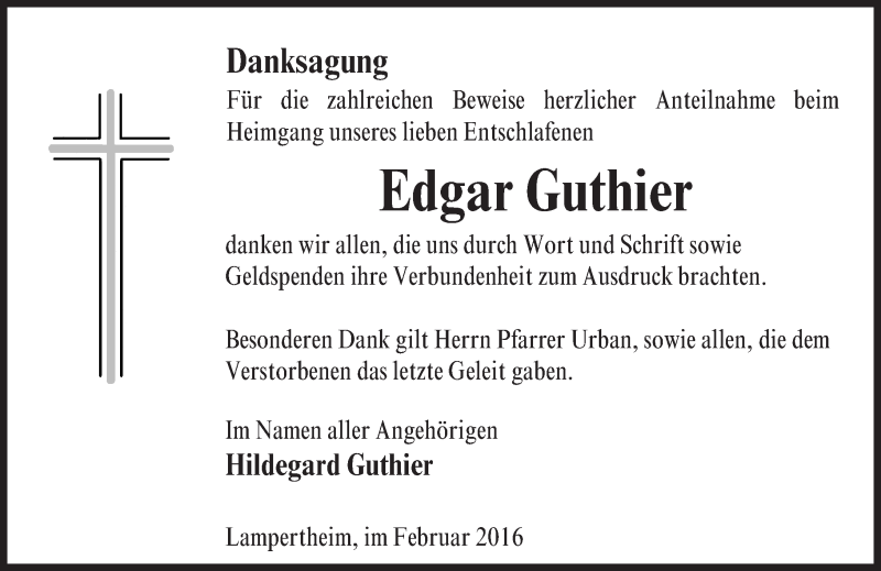 Hier finden Sie alle Traueranzeigen aus der Zeitung, die bisher für Edgar Guthier erschienen sind. Weitere Traueranzeigen, die in der Zeitung erscheinen, werden hier ebenfalls aufgelistet
