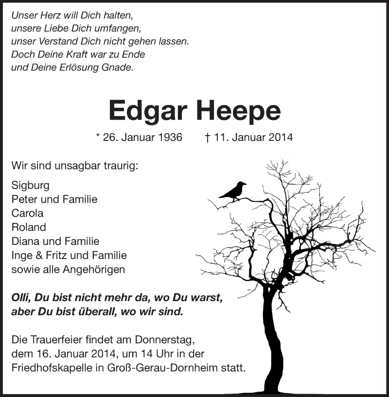 Hier finden Sie alle Traueranzeigen aus der Zeitung, die bisher für Edgar Heepe erschienen sind. Weitere Traueranzeigen, die in der Zeitung erscheinen, werden hier ebenfalls aufgelistet