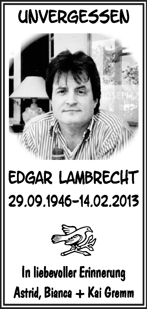 Hier finden Sie alle Traueranzeigen aus der Zeitung, die bisher für Edgar Lambrecht erschienen sind. Weitere Traueranzeigen, die in der Zeitung erscheinen, werden hier ebenfalls aufgelistet
