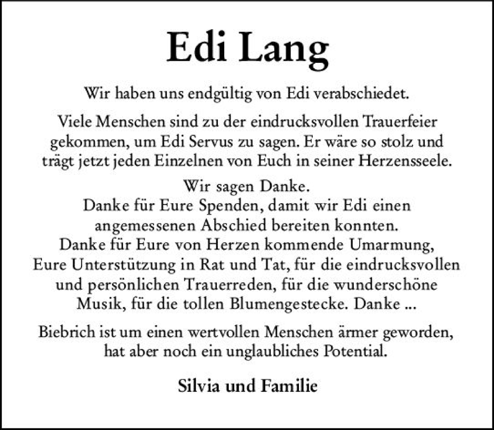 Hier finden Sie alle Traueranzeigen aus der Zeitung, die bisher für Edi Lang erschienen sind. Weitere Traueranzeigen, die in der Zeitung erscheinen, werden hier ebenfalls aufgelistet