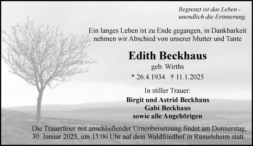 Hier finden Sie alle Traueranzeigen aus der Zeitung, die bisher für Edith Beckhaus erschienen sind. Weitere Traueranzeigen, die in der Zeitung erscheinen, werden hier ebenfalls aufgelistet