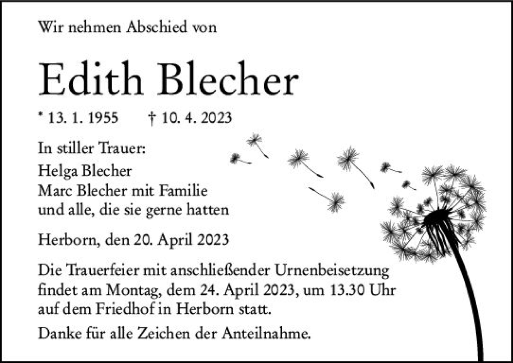 Hier finden Sie alle Traueranzeigen aus der Zeitung, die bisher für Edith Blecher erschienen sind. Weitere Traueranzeigen, die in der Zeitung erscheinen, werden hier ebenfalls aufgelistet