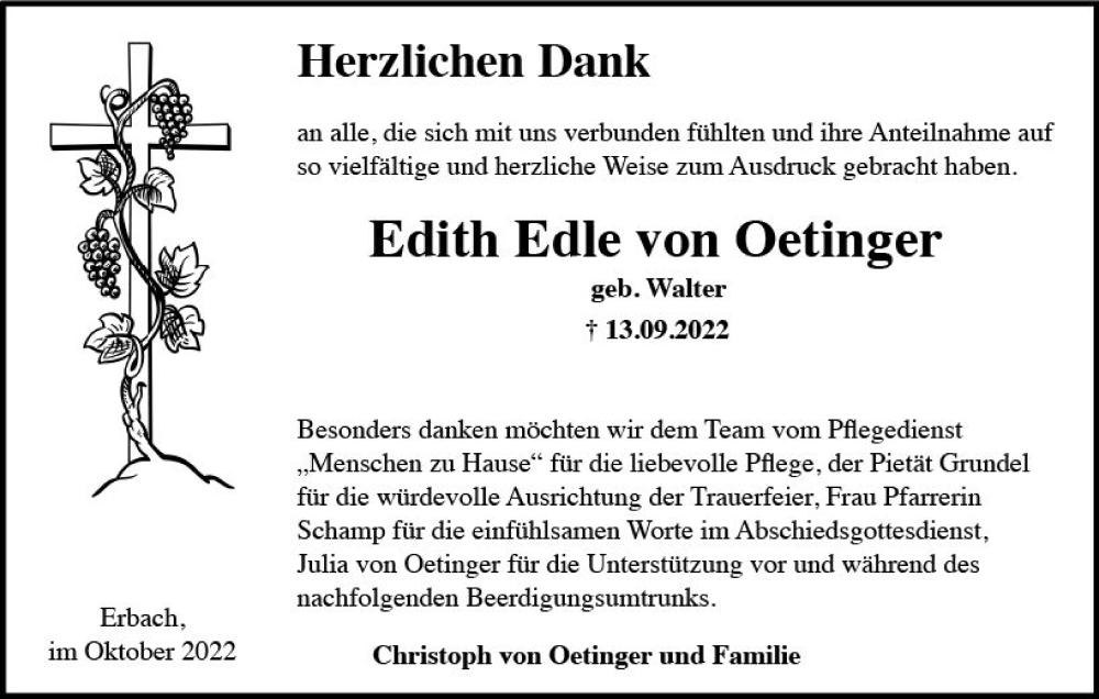 Hier finden Sie alle Traueranzeigen aus der Zeitung, die bisher für Edith Edle von Oetinger erschienen sind. Weitere Traueranzeigen, die in der Zeitung erscheinen, werden hier ebenfalls aufgelistet
