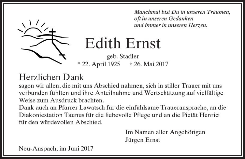 Hier finden Sie alle Traueranzeigen aus der Zeitung, die bisher für Edith Ernst erschienen sind. Weitere Traueranzeigen, die in der Zeitung erscheinen, werden hier ebenfalls aufgelistet